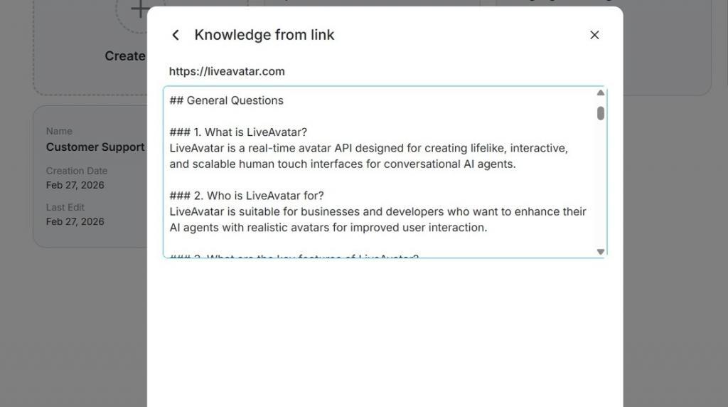 Once the URL is added, LiveAvatar crawls the page and produces a summary of the information it finds. That gives you a faster way to ground the avatar in product information, service pages, documentation, knowledge hubs, or other reference material.