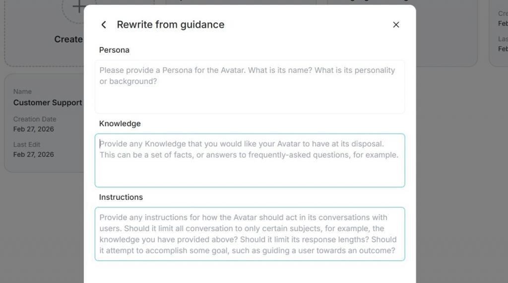 This is also where you start to see how the platform is structured. The avatar itself is only one layer. Underneath it, you are really building a combination of visual identity, context, instructions, and conversation logic.
